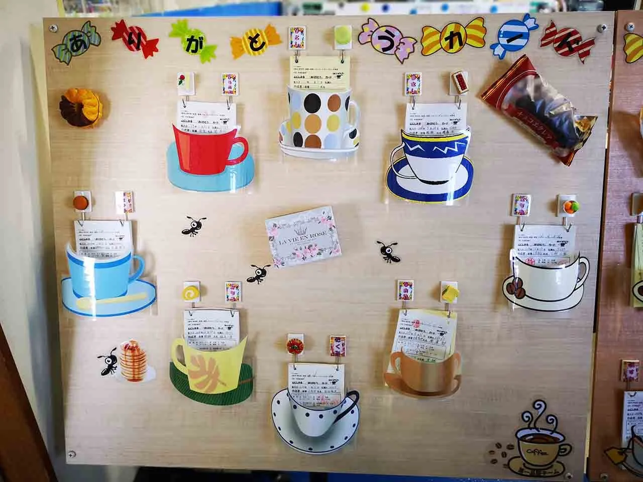 On the plant tour, we saw a great example of how they influence happiness. Every area had a themed thank you card area. It's a formal way for employees to express their appreciation for one another. As with Ina Foods, their reward system is not extrinsic. The team members' thank you cards can be seen next to each other. Employees are identified by icons and encouraged to give at least one thank you card to each other monthly. One of the team's boards was themed around a Japanese folk tale. A second team used donuts and coffee. One group used a Ferris wheel, where the employee with the most thank you's would fall to the bottom and catch a prize on the way down.